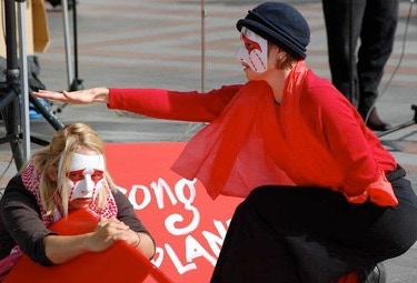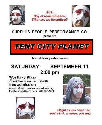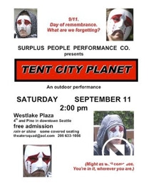 Masks, movement, visual art and spoken word will be part of TENT CITY PLANET, an outdoor theatrical protest event on 9/11 to remember forgotten, invisible, surplus people, from the captive population of Gaza to the still-unreturned evacuees from New Orleans to expelled hutong-dwellers in China to the homeless residents of Seattle.
